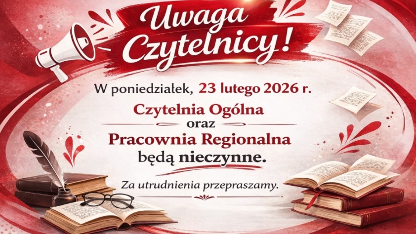 Uwaga! W dniach 23–28.02.2026 Filia nr 23 przy ul. Konopnickiej 28 (Szwederowo) będzie nieczynna z powodu kontroli księgozbioru.