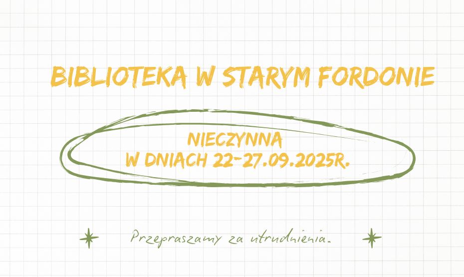 Informujemy, że w dniach od 22-27.09.2025 roku Biblioteka w Starym Fordonie filia nr 24 dla dorosłych z Oddziałem dla dzieci i młodzieży przy  ul. Pielęgniarskiej 17  będzie nieczynna z powodu kontroli księgozbioru.