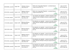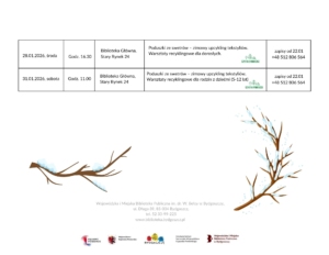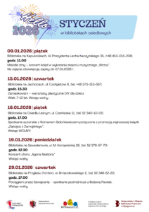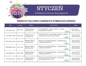 Wydarzenia – STYCZEŃ 2026 Biblioteka Główna POBIERZ – skrót wydarzeń w Bibliotece Głównej POBIERZ – Warsztaty dla dzieci i dorosłych – styczeń 2026! Biblioteki osiedlowe POBIERZ – skrót wydarzeń w bibliotekach osiedlowych POBIERZ – Tabela z imprezami w bibliotekach osiedlowych – styczeń 2026 POBIERZ – Zajęcia dla dzieci z Ukrainy styczeń 2026 Wydarzenia – LUTY 2026 Biblioteka Główna Biblioteki osiedlowe Zajęcia edukacyjne w bibliotekach osiedlowych